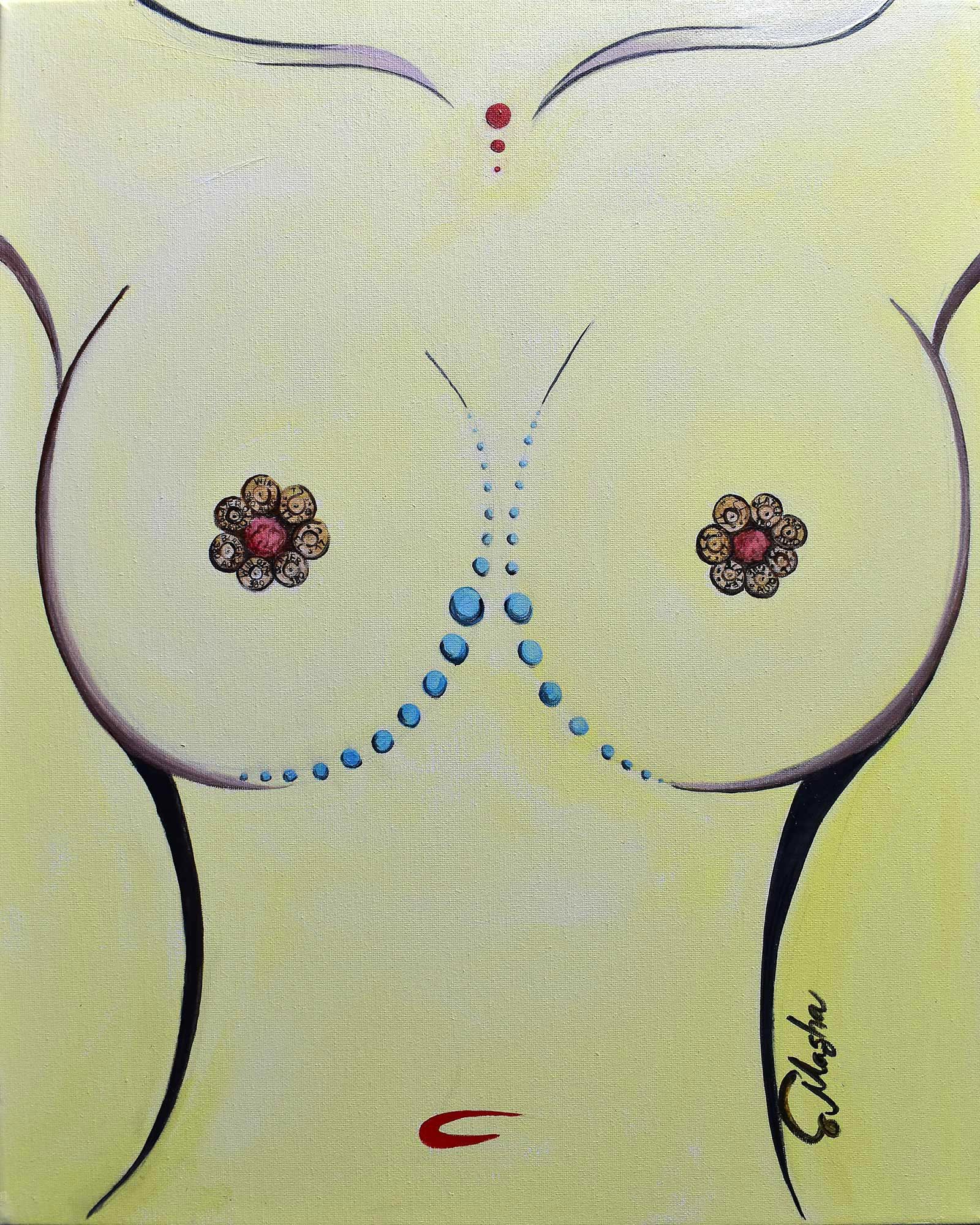 A line of blue droplets arcs from the collarbone to the pelvis like a spiritual spine, symbolizing grace under fire. The collarbones themselves take on the form of owl whiskers, a subtle nod to wisdom, silent flight, and sharp perception. This figure does not shrink. She does not hide. Bulletproof is a portrait of feminine resilience that whispers: beauty can protect, seduction can defend, and softness can survive even the sharpest shots.