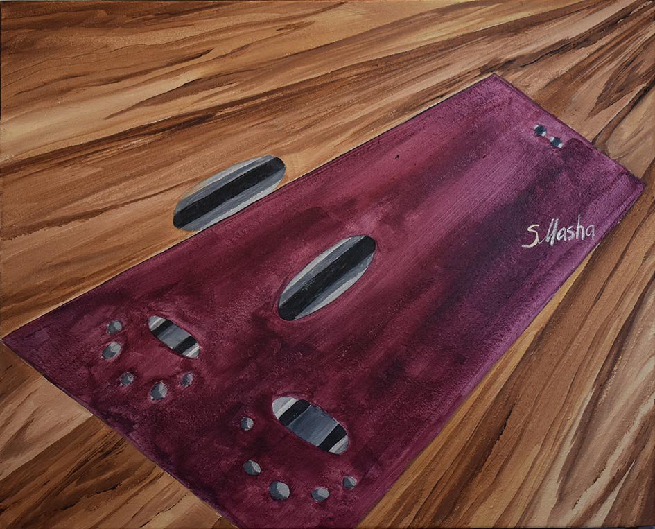Masha captures the intensity of effort and contact in Perfect Pushup. A deep burgundy mat rests on polished floorboards, punctuated by a series of ovals that mark the exact spots where arm meets torso at the ideal push-up angle. These precise impressions celebrate the synergy of muscle and form, highlighting the harmony between tension and support in each flawless repetition.