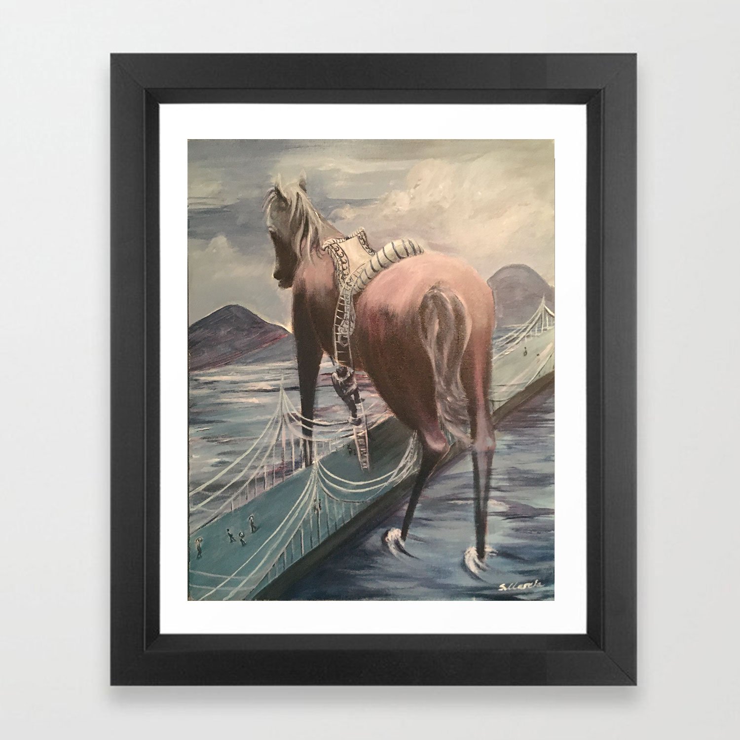 In Safe Passage, the dreamscape bends reality into a vision both strange and reassuring. A colossal horse, its legs impossibly long, steps lightly across water as if crossing into another state of mind. The bridge beneath it, webbed with delicate cables, becomes both pathway and tether, carrying tiny human figures toward an unseen destination. The horseâs ornate saddle and dangling ladder suggest invitation, a chance to climb onto something greater than oneself and be carried forward.