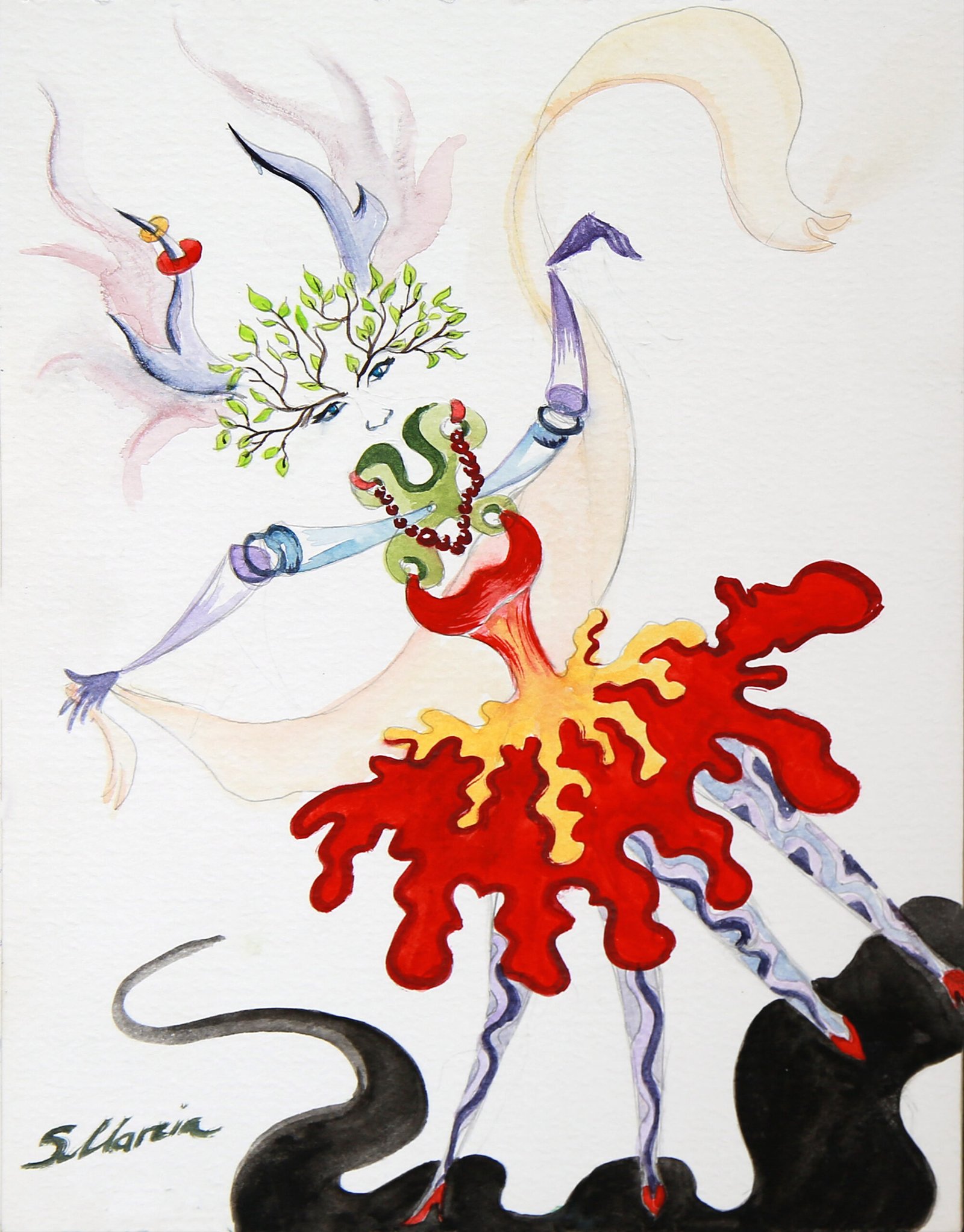 Masha transforms the electric pulse of salsa into a living form in Salsa Dancer. A flame-red skirt erupts like molten lava, each swirl and curve capturing the dance’s rapid footwork and fluid grace. Branch-like antlers crown her head to symbolize how improvisation and structure grow together, while graceful arms and mechanical elements trace the dancer’s technical precision across the canvas. This dynamic composition celebrates the joyous tension between disciplined form and spontaneous spirit.